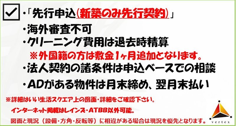 ※ペット飼育及び事務所・SOHO可については物件の管理規約で可能になっている場合でも、各部屋の所有者様次第で禁止となっている場合がございます。